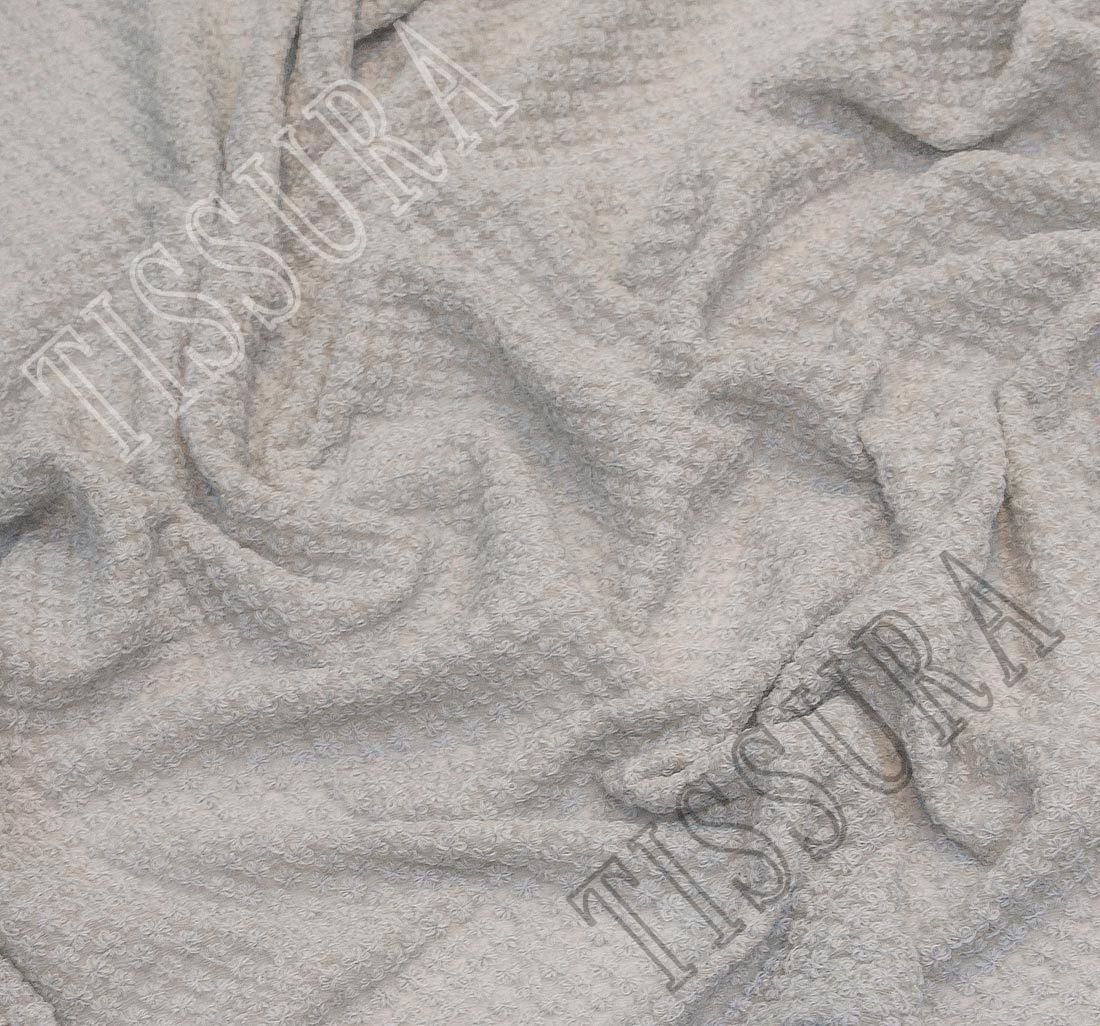 This exclusive chiffon fabric is embroidered with woolen threads in an all-over floral pattern. The ground is 100% silk with a crinkled effect, sheer and grey tinted. Floral embroidery is an all-time favourite among fashion lovers, and this soft fabric is perfect for those looking for something fancy. Its thick, yet lightweight nature makes it ideal for dresses, jackets, tops and even skirts. The color of embroidery is slate blue.