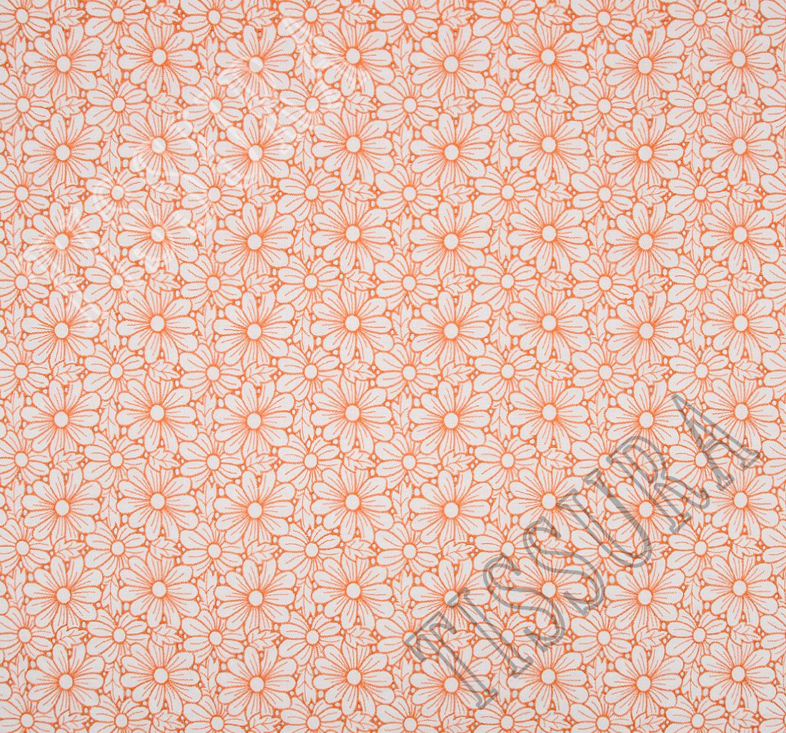 This Italian cotton poplin fabric boasts a marvelous eyelet design. The white background is embroidered with blooming chamomiles in juicy orange. Made of pure cotton, it is pleasantly soft and breathable. This thin cotton poplin fabric is perfect for summer dresses, tops, skirts, children's wear and more. Available in three more shades.