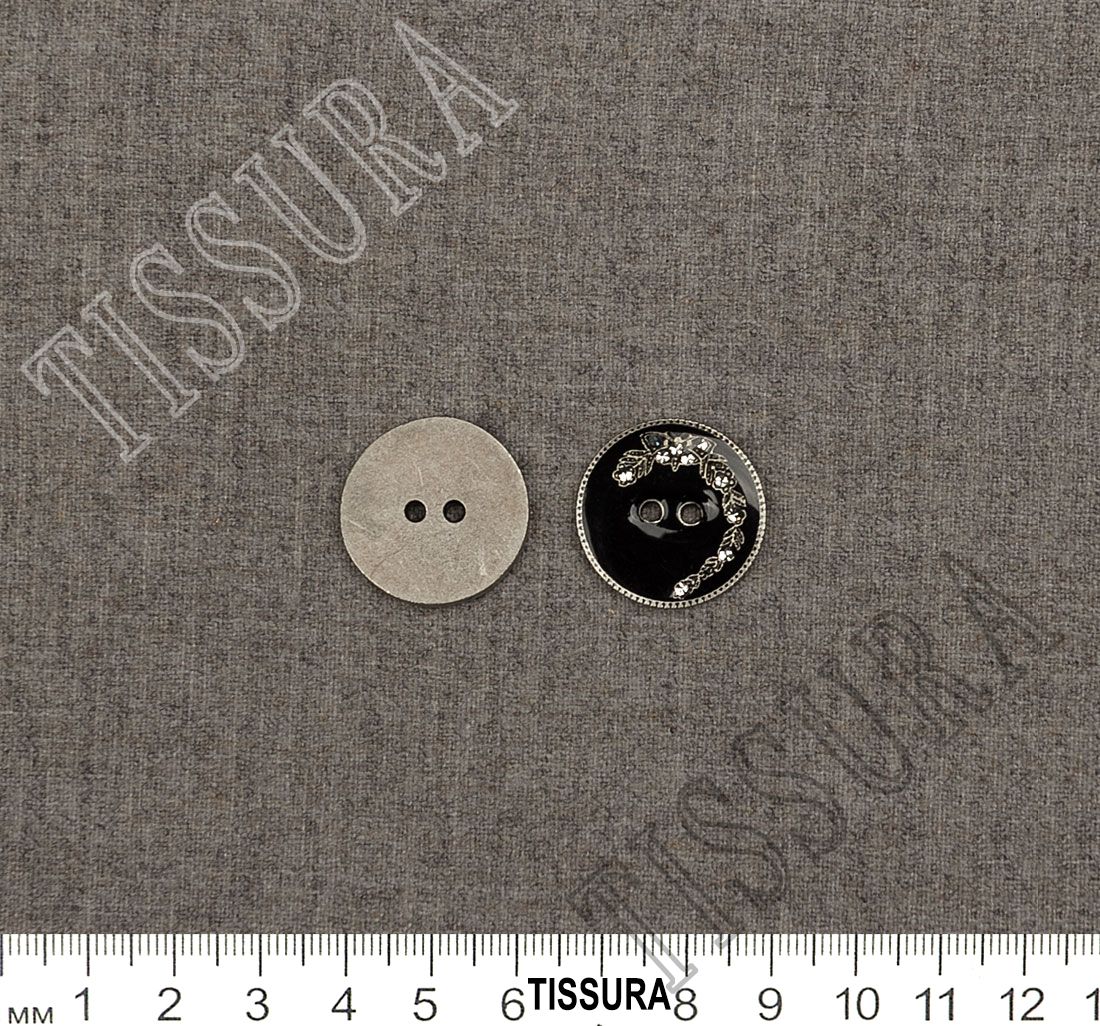 This round metal button features a two-hole design. It is coated with black enamel and adorned with flower-and-butterfly engraved detailing. Tiny crystals add a mysterious sparkle.