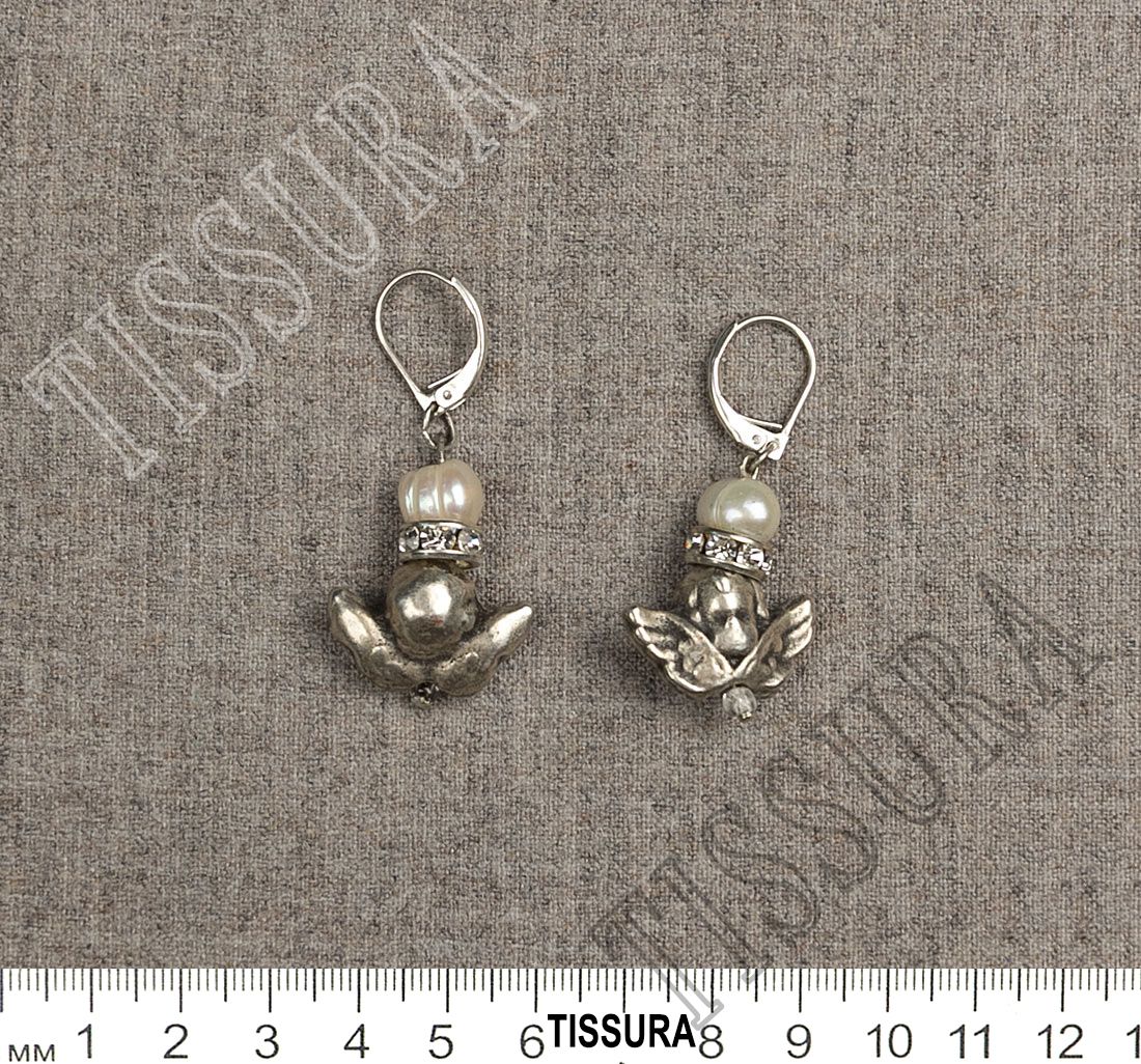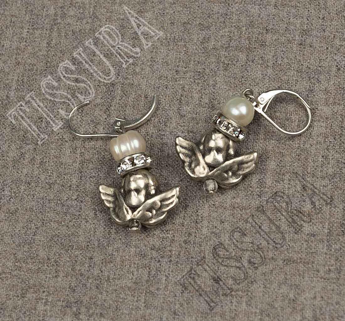 These silver coated earrings feature a winged angel, topped off with a rhinestone detail and a faux pearl. They are equipped with a lobster clasp.