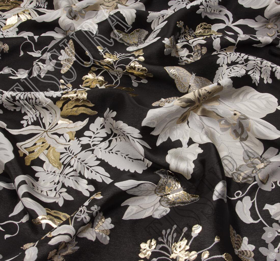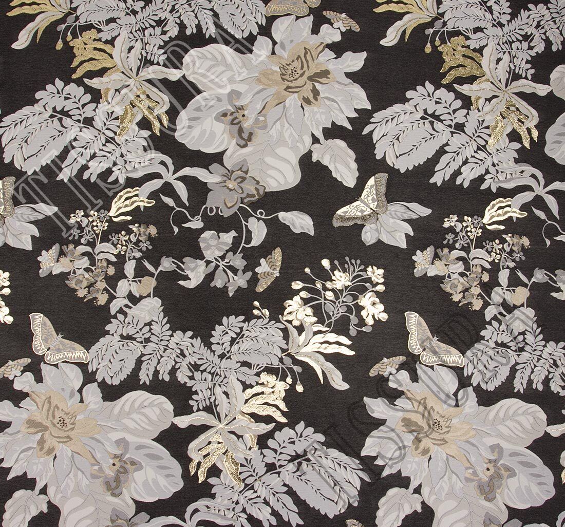 Design — the pattern features a floral and botanical pattern on a black background. Before the invention of the jacquard loom, such patterns were made by hand and involved a lot of labor and time. Nowadays, highly detailed motifs are woven automatically in a much shorter time. The secret is in controlling warp yarns. The jacquard loom creates a pattern by selecting and lifting warp yarns.