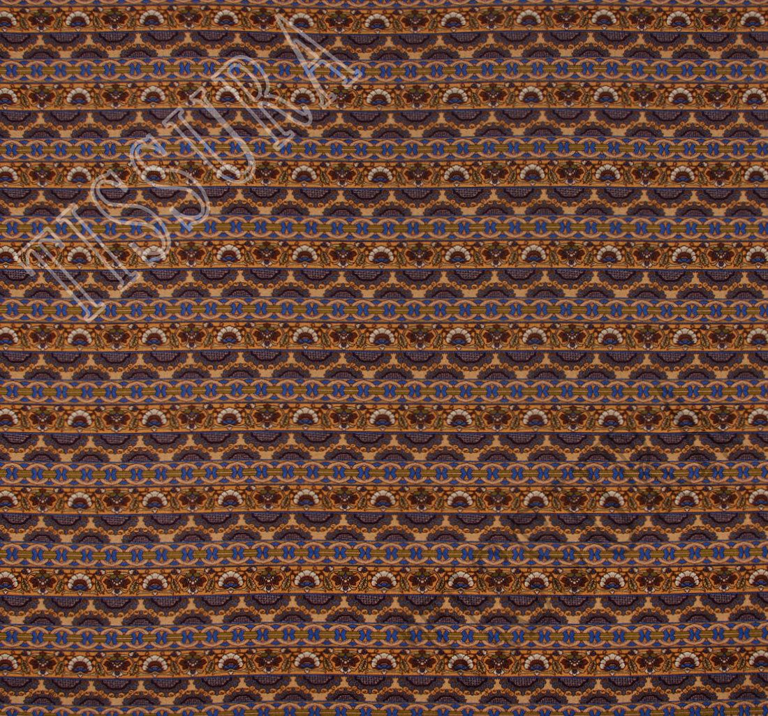 This stretch jersey fabric boasts a colorful line pattern. It is composed of floral and ethnical ornaments in beige, blue and purple. Viscose ensures a remarkable softness and an easy drape. A touch of elastane lends some stretch for ultra comfort in wear. With a boho look and a heavenly touch, our printed jersey fabric works best sewn into a bodycon dress, a daring top or a long skirt.