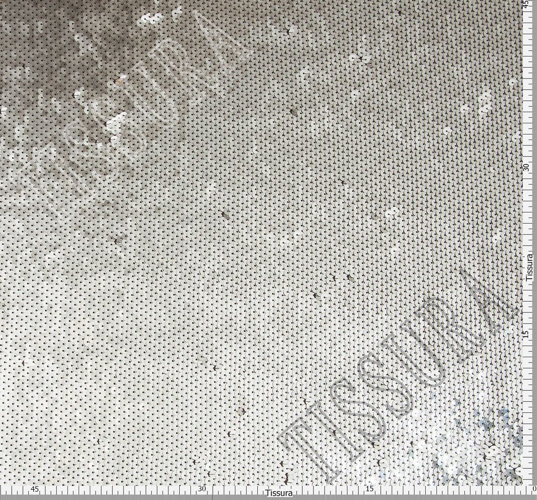 This fancy sequined fabric consists of a lightweight synthetic ground, embroidered with flat reversible sequins. They are neatly arranged in a half-overlapping manner, also known as fishscale, and can be flipped in both directions, showing a different shiny color. Glossy as a mirror, this fabric is quite heavy, yet splendid in all its shining beauty.